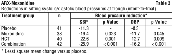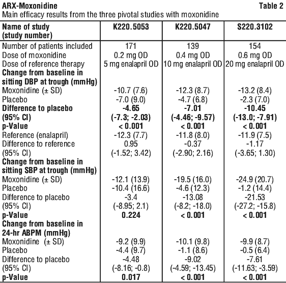 The combination of hydrochlorothiazide and moxonidine was evaluated in a further placebo-controlled, double-blind and prospectively randomised trial. The study comprised a total of 161 randomised patients: 37 received moxonidine 0.4 mg, 40 received hydrochlorothiazide 25 mg, 42 received the combination 0.4/25 mg and 41 received placebo, all once daily. Sitting systolic and diastolic blood pressures at trough after eight weeks treatment were statistically significantly reduced for all active treatment arms versus placebo. Furthermore, the difference of the combination for sitting diastolic blood pressure was statistically significant in favour of the combination for both monotherapies. The incidence of treatment emergent adverse events did not differ significantly between groups: 32.5% with moxonidine, 25% with HCT, 30% with the combination and 23% with placebo. See Table 3.