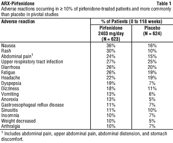 The most commonly reported adverse reactions during clinical study experience with pirfenidone at a dose of 2403 mg/day compared to placebo, respectively, were nausea (32.4% versus 12.2%), rash (26.2% versus 7.7%), diarrhoea (18.8% versus 14.4%), fatigue (18.5% versus 10.4%), dyspepsia (16.1% versus 5.0%), anorexia (11.4% versus 3.5%), headache (10.1% versus 7.7%), and photosensitivity reaction (9.3% versus 1.1%). Serious adverse reactions were recorded at similar frequencies among patients treated with 2403 mg/day of pirfenidone and placebo in clinical studies.