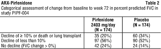 In study PIPF 004, the decline in percent predicted FVC from baseline at week 72 of treatment was significantly reduced in patients receiving pirfenidone (N = 174) compared with patients receiving placebo (N = 174; p = 0.001, rank ANCOVA). Treatment with pirfenidone also significantly reduced the decline in percent predicted FVC from baseline at weeks 24 (p = 0.014), 36 (p < 0.001), 48 (p < 0.001), and 60 (p < 0.001). At week 72, a decline from baseline in percent predicted FVC of ≥ 10% (a threshold indicative of the risk of mortality in IPF) was seen in 20% of patients receiving pirfenidone compared to 35% receiving placebo (see Table 2).
