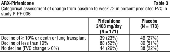 In study PIPF 006, treatment with pirfenidone (N = 171) did not reduce the decline in percent predicted FVC from baseline at week 72 compared with placebo (N = 173; p = 0.501). However, treatment with pirfenidone reduced the decline in percent predicted FVC from baseline at weeks 24 (p < 0.001), 36 (p = 0.011), and 48 (p = 0.005). At week 72, a decline in FVC of ≥ 10% was seen in 23% of patients receiving pirfenidone and 27% receiving placebo (see Table 3).
