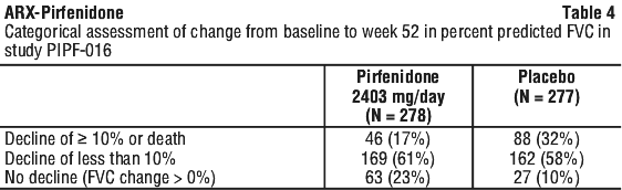 In study PIPF-016, the decline in percent predicted FVC from baseline at week 52 of treatment was significantly reduced in patients receiving pirfenidone (N = 278) compared with patients receiving placebo (N = 277; p < 0.000001, rank ANCOVA). Treatment with pirfenidone also significantly reduced the decline in percent predicted FVC from baseline at weeks 13 (p < 0.000001), 26 (p < 0.000001), and 39 (p = 0.000002). At week 52, a decline from baseline in percent predicted FVC of ≥ 10% or death was seen in 17% of patients receiving pirfenidone compared to 32% receiving placebo (see Table 4).