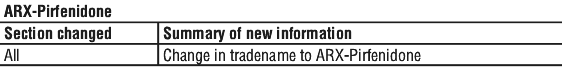 In patients who experience intolerance to therapy due to gastrointestinal side effects, patients should be reminded to take the medicinal product with food. If symptoms persist the dose of ARX-Pirfenidone may be reduced to 267 mg-534 mg taken two to three times a day with food with re-escalation to the recommended daily dose as tolerated. Consider changing from the 801 mg dose form to a 267 mg dose form. If symptoms continue, patients may be instructed to interrupt treatment for one to two weeks to allow symptoms to resolve.