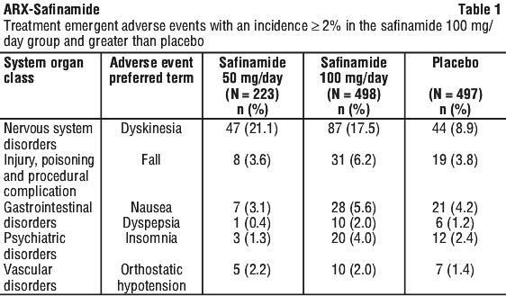 Treatment Emergent Adverse Events (TEAEs) with an incidence of at least 2% in the safinamide 100 mg/day and greater than placebo from the two pivotal, Phase III, randomised, double-blind, placebo-controlled, 26 week safinamide clinical trials (NW-016 and 27919 [SETTLE]) are presented in Table 1. The most common TEAEs associated with safinamide treatment were dyskinesia, fall, nausea, and insomnia.