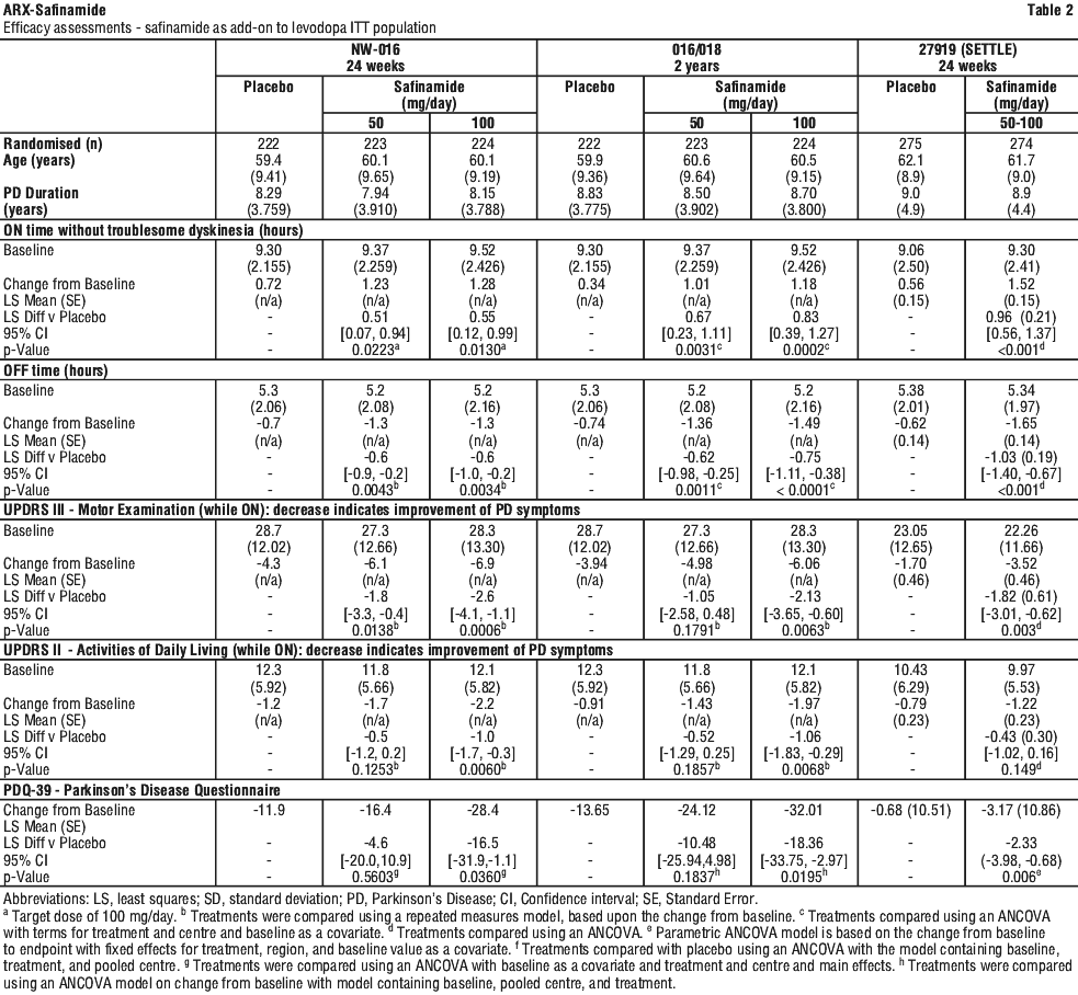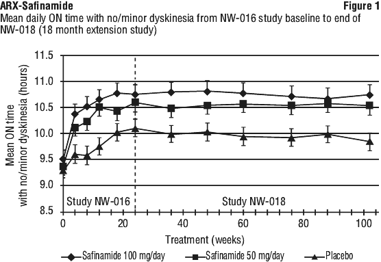 In NW-016, mean (SD) change in daily ON time without troublesome dyskinesia after 24 weeks (6 months) was +1.37 (SD: 2.745) hours for safinamide 50 mg/day, +1.36 (2.625) hours for safinamide 100 mg/day and +0.97 (2.375) hours for placebo (least-squares mean difference: 50 mg/day safinamide: +0.51 hours, 95% CI, 0.07-0.94 hours; p=0.0223; 100 mg/day safinamide: +0.55 hours, 95% CI, 0.12-0.99, p=0.0130). The increase in daily ON time without troublesome dyskinesia for both safinamide doses compared to placebo was maintained at the end of NW-018, the 18-month extension to NW-016; compared to baseline, the mean (SD) daily change in ON time after 2 years was +1.15 (SD: 2.75) hours for safinamide 50 mg/day; +1.19 (2.88) hours for safinamide 100 mg/day, and +0.56 (2.51) hours for placebo (least-squares mean difference: 50 mg/day safinamide: +0.67 hour, 95% CI, 0.23-1.11 hours; p=0.0031; 100 mg/day safinamide: +0.83 hour, 95% CI, 0.39-1.27, p=0.0002).