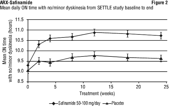 In SETTLE, mean (SD) change in daily ON time without troublesome dyskinesia after 24 weeks (6 months) was +1.42 (2.80) hours for safinamide, from a baseline of 9.30 (2.41) hours, compared to +0.57 (2.47) hours for placebo, from a baseline of 9.06 (2.50) hours (least-squares mean difference, 0.96 hour; 95% CI, 0.56-1.37 hours; p < 0.001). In both NW-016 and SETTLE the increase in ON time was accompanied by a similar significant reduction in OFF time and a reduction in UPDRS section III - Motor Examination score assessed during ON time (Table 2).