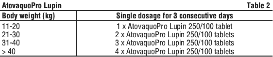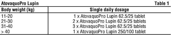 AtovaquoPro Lupin 250/100 or AtovaquoPro Lupin 62.5/25 tablets should preferably be swallowed whole. If difficulties are encountered when dosing young children, the tablet(s) may be crushed and added to a small amount of milk, all of which should be consumed immediately.