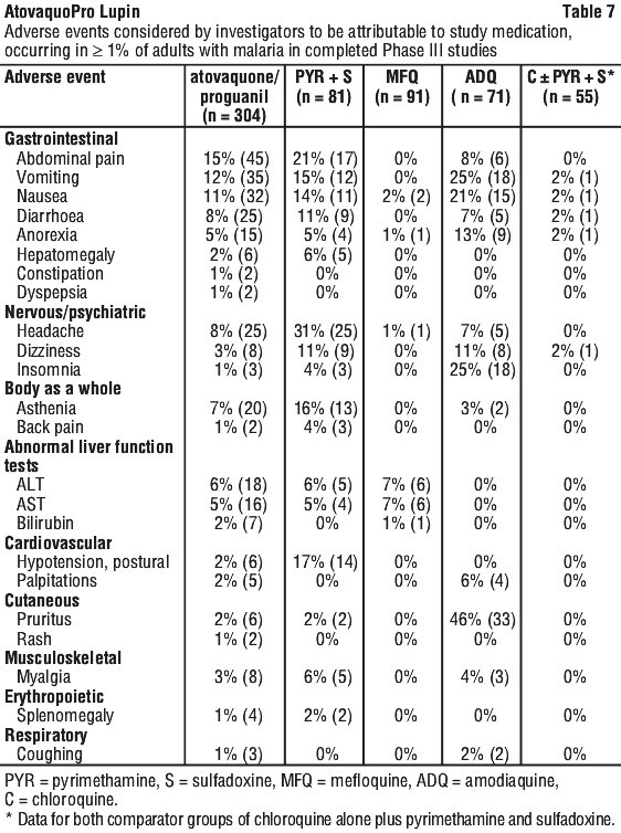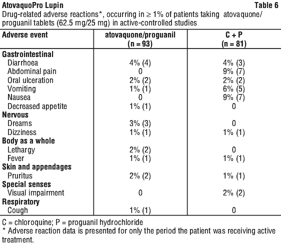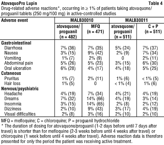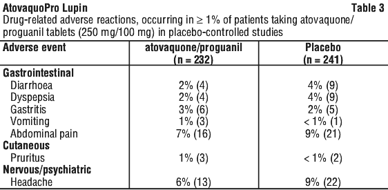 The nature and frequency of adverse reactions reported in clinical trials of atovaquone/proguanil tablets for the prophylaxis of malaria in individuals weighing > 40 kg were similar to those reported with placebo or the active comparator drug (mefloquine or chloroquine/proguanil). However, patients receiving atovaquone/proguanil tablets had fewer neuropsychiatric and gastrointestinal adverse reactions than patients receiving mefloquine and chloroquine/proguanil respectively. Overall, atovaquone/proguanil has a better safety profile than mefloquine or chloroquine/proguanil (see Tables 3 and 4).