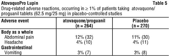 As AtovaquoPro Lupin contains atovaquone and proguanil hydrochloride, the type and severity of adverse reactions associated with each of the compounds may be expected. However, at the doses employed for both treatment and prophylaxis of malaria, adverse reactions are generally mild and of limited duration. There is no evidence of added toxicity following concurrent administration of the two compounds.