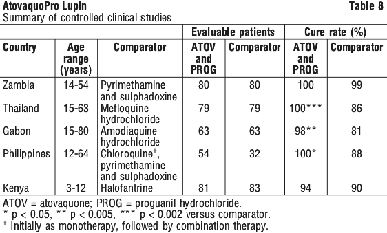 In the controlled clinical trials, the study population included only patients with uncomplicated falciparum malaria. The comparator was standard antimalarial therapy within the country in which the study was conducted. Treatment with combination of atovaquone and proguanil hydrochloride was curative in 98% of evaluable patients (combined result). The concurrent administration of atovaquone and proguanil hydrochloride was more efficacious in three studies and of equivalent efficacy in two trials as the respective comparator antimalarial regimen (Table 8).