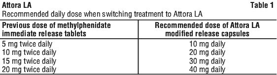 The recommended dose of Attora LA should be equal to the total daily dose of the immediate-release formulation not exceeding a total dose of 60 mg in children and 80 mg in adults. Examples involving switch from methylphenidate immediate-release tablets are provided in Table 1.