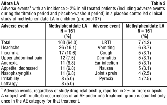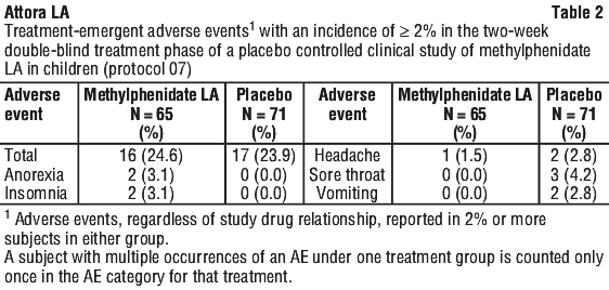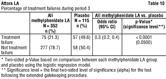 Maintenance of effect of Methylphenidate LA was evaluated by measuring the percentage of treatment failure in Methylphenidate LA compared to the placebo group at the end of a 6-month maintenance period (see Table 10). Completion rates varied across the treatment groups, with the lowest rate in the placebo group (34.1%) and rates between 47.7% and 58.3% across the Methylphenidate LA dose group. Once the Methylphenidate LA dose was optimized in Period 2, approximately 79 % of patients continued to maintain disease control for a period of at least 6 months compared with approximately 50% given placebo (p < 0.0001 vs. placebo). An odds ratio of 0.3 suggested that patients treated with placebo had a 3 times higher chance of becoming a treatment failure compared to Methylphenidate LA.