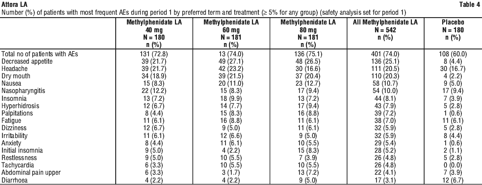 Significant clinical efficacy was demonstrated in all three Methylphenidate LA dose levels using physician rated scales [Clinical Global Impression- Improvement (CGI-I) and Clinical Global Improvement-Severity (CGI-S)], self-rated scales [Adult Self-Rating Scale (ASRS)] and observer- rated scales [Conners' Adult ADHD Rating Scale Observer Short Version (CAARS O:S)]. The results were consistently in favour of Methylphenidate LA over placebo across all assessments in period 1.