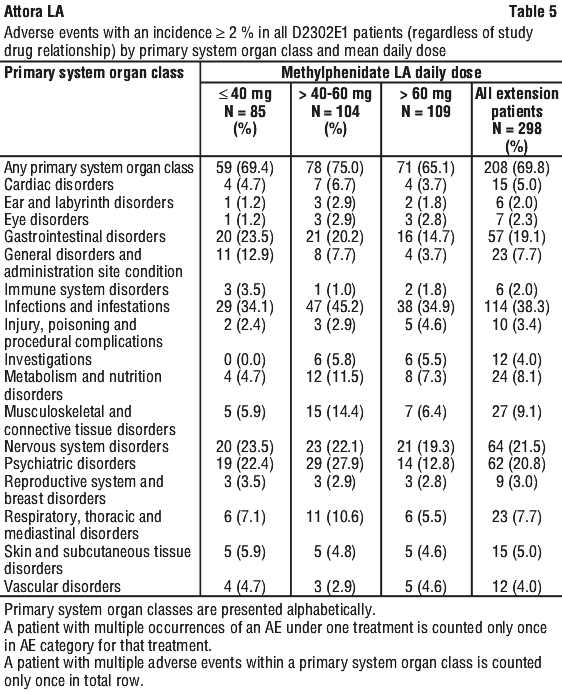 Patients who entered Period 3 had completed a total of between 5-14 weeks of Methylphenidate LA treatment in Periods 1 and 2. Patients then assigned to placebo in Period 3 did not experience increased signs of withdrawal and rebound compared to patients who continued on Methylphenidate LA treatment. The study performed in adults did not suggest any difference in efficacy or safety amongst gender subgroups (see Section 4.2 Dose and Method of Administration.