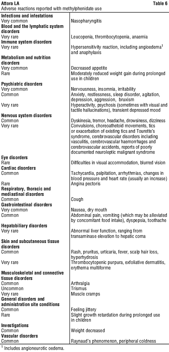 Adverse drug reactions from spontaneous reports and literature cases (frequency not known). The following adverse drug reactions have been derived from post-marketing experience with methylphenidate via spontaneous case reports and literature cases. Because these reactions are reported voluntarily from a population of uncertain size, it is not possible to reliably estimate their frequency which is therefore categorized as not known. Adverse drug reactions are listed according to system organ classes in MedDRA. Within each system organ class, ADRs are presented in order of decreasing seriousness.