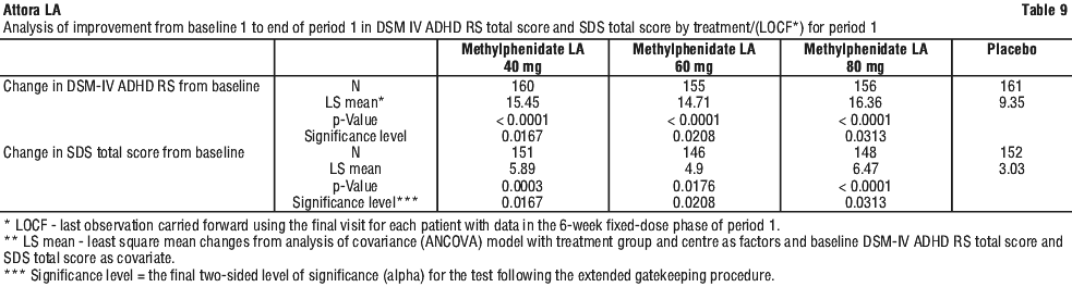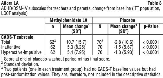 Efficacy was assessed using the DSM-IV ADHD rating scale (DSM-IV ADHD RS) for symptomatic control and Sheehan Disability Score (SDS) for functional improvement as change in respective total scores from baseline to the end of the first period. All dose levels of Methylphenidate LA showed significantly greater symptom control (p < 0.0001 for all dose levels) compared to placebo as measured by a reduction in DSM-IV ADHD RS total score. All doses of Methylphenidate LA showed significantly greater functional improvement (p = 0.0003 at 40 mg, p = 0.0176 at 60 mg, p < 0.0001 at 80 mg) compared to placebo as measured by reduction in SDS total score (see Table 9).