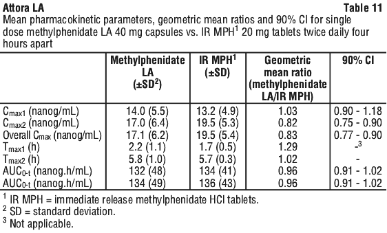 The mean pharmacokinetic parameters for methylphenidate LA 40 mg capsules administered as a single dose once daily compared to methylphenidate HCl 20 mg immediate-release tablets administered twice daily four hours apart are summarised in Table 11.