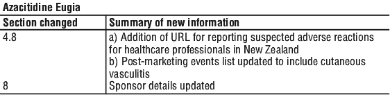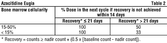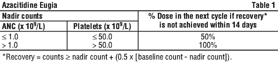 If haematological toxicity is observed following Azacitidine Eugia treatment (as defined by: platelets < 50.0 x 109/L and/or ANC < 1 x 109/L) the next cycle of Azacitidine Eugia therapy should be delayed until the platelet count and the ANC have recovered. If recovery is achieved within 14 days, no dose adjustment is necessary. If recovery has not been achieved within 14 days, the dose should be reduced according to Table 1. Following dose modifications, the cycle duration should return to 28 days.