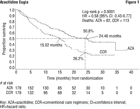 In the Intent to Treat analysis of 358 patients (179 azacitidine and 179 CCR), azacitidine treatment was associated with a median survival of 24.5 months versus 15 months for those receiving CCR treatment, an improvement of 9.4 months with a stratified log-rank p-value of 0.0001. The hazard ratio describing this treatment effect was 0.58 (95% CI: 0.43, 0.77). The two-year survival rates were 50.8% versus 26.2% for patients receiving azacitidine versus CCR (p < 0.0001). The survival benefit was apparent from as early as 3.5 months. See Figure 1.