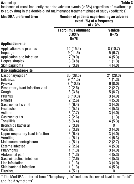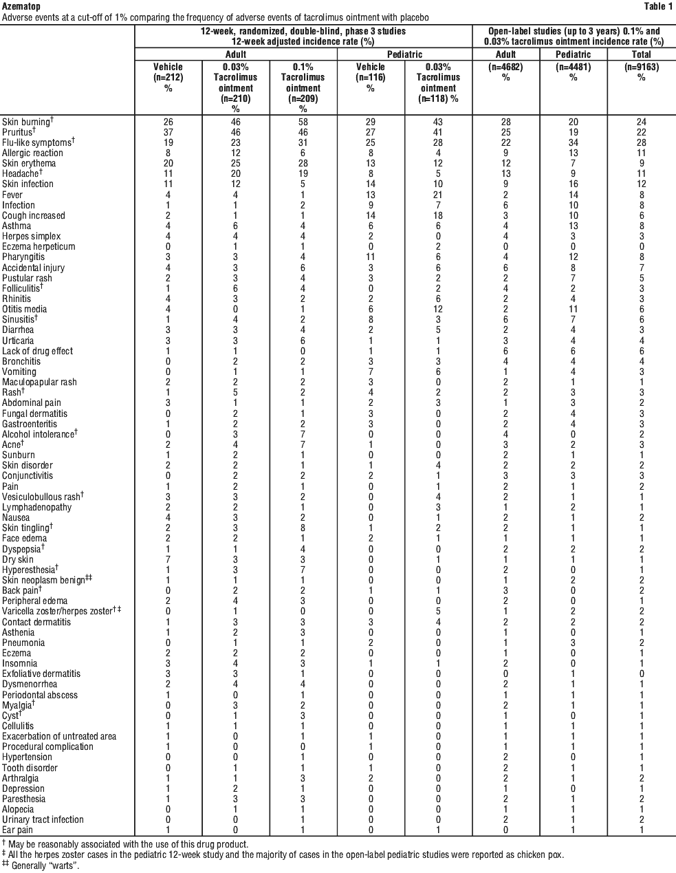 Other adverse events which occurred at an incidence between 0.2% and less than 1% in clinical studies in the above table include: abnormal vision, abscess, anaphylactoid reaction, anemia, anorexia, anxiety, arthritis, arthrosis, bilirubinemia, blepharitis, bone disorder, breast neoplasm benign, bursitis, cataract NOS, chest pain, chills, colitis, conjunctival edema, constipation, cramps, cutaneous moniliasis, cystitis, dehydration, dizziness, dry eyes, dry mouth/nose, dyspnea, ear disorder, ecchymosis, edema, epistaxis, eye pain, furunculosis, gastritis, gastrointestinal disorder, hernia, hypercholesterolemia, hypertonia, hypothyroidism, joint disorder, laryngitis, leukoderma, lung disorder, malaise, migraine, moniliasis, mouth ulceration, nail disorder, neck pain, neoplasm benign, oral moniliasis, otitis externa, photosensitivity reaction, rectal disorder, seborrhea, skin carcinoma, skin discoloration, skin hypertrophy, skin ulcer, stomatitis, tendon disorder, thinking abnormal, tooth caries, sweating, syncope, tachycardia, taste perversion, unintended pregnancy, vaginal moniliasis, vaginitis, valvular heart disease, vasodilatation, and vertigo. Table 3 describes the most frequently reported adverse events (≥ 3%) that occurred in the Phase 3 study in pediatrics.