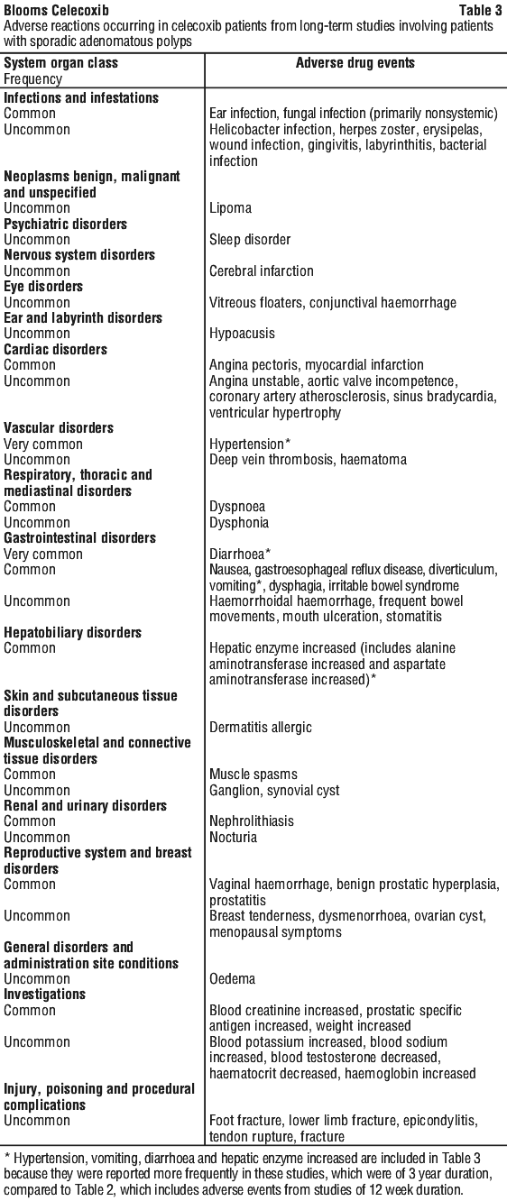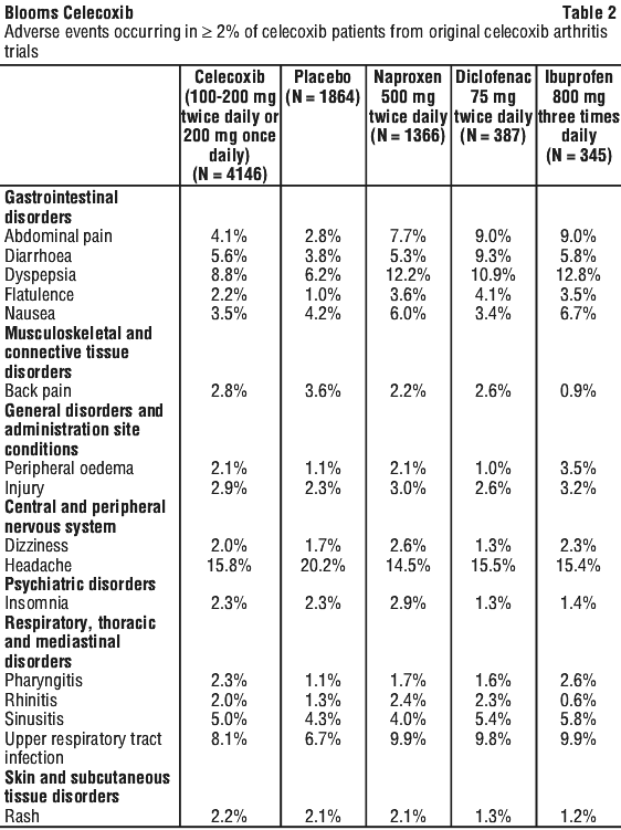 Blooms Celecoxib 100 mg and 200 mg capsules contain the inactive (excipients) ingredients lactose monohydrate, sodium lauryl sulfate, carrageenan, cellulose - microcrystalline, silica-colloidal anhydrous, talc - purified and magnesium stearate. The capsule shells contain gelatin, titanium dioxide and the inks contain indigo carmine (100 mg capsule); iron oxide yellow and iron oxide red (200 mg capsule).