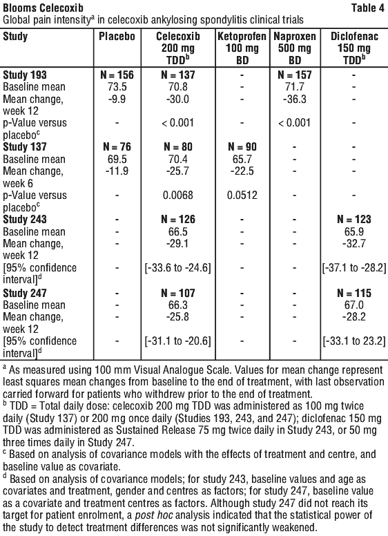 Ankylosing spondylitis (AS). Celecoxib has been investigated in 896 patients in placebo and active (diclofenac, naproxen or ketoprofen) controlled clinical trials of 6 weeks (one trial) and 12 weeks (three trials) duration for the symptomatic treatment of AS. At doses of 100 mg twice daily (BD), 200 mg once daily (OD), and 400 mg once daily (OD), celecoxib was statistically superior to placebo for all measures of efficacy including global pain intensity, global disease activity and functional impairment. In two 12 week studies of celecoxib at 200 mg total daily dose and 400 mg total daily dose, non-inferiority was demonstrated relative to diclofenac 150 mg total daily dose for global pain intensity.