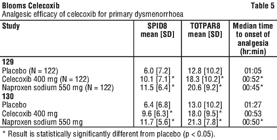 On the basis of the primary measures of efficacy, Studies 129 and 130 show that celecoxib is significantly superior to placebo in the treatment of primary dysmenorrhoea. In Study 129, the median Time to Onset of Analgesia for celecoxib was significantly shorter than that observed for placebo. In Study 130, the median Time to Onset of Analgesia for celecoxib was shorter than that observed for placebo, but the difference was not significant. See Table 5.