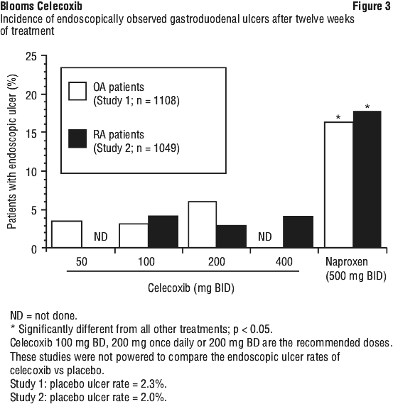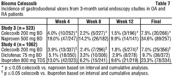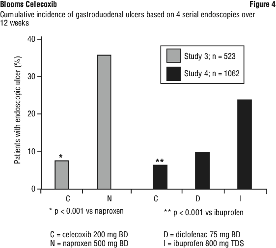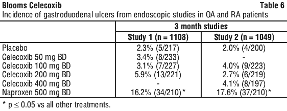 Endoscopic studies. Scheduled upper GI endoscopic evaluations were performed in over 4,500 arthritis patients who were enrolled in five controlled randomised 12-24 week trials using active comparators, two of which also included placebo controls. Twelve-week endoscopic ulcer data are available on approximately 1,400 patients and 24 week endoscopic ulcer data are available on 184 patients on celecoxib at doses ranging from 50-400 mg BD. In all three studies that included naproxen 500 mg BD, and in the study that included ibuprofen 800 mg TDS, celecoxib was associated with a statistically significantly lower incidence of endoscopic ulcers over the study period. Two studies compared celecoxib with diclofenac 75 mg BD; one study revealed a statistically significantly higher prevalence of endoscopic ulcers in the diclofenac group at the study endpoint (6 months on treatment), and one study revealed no statistically significant difference between cumulative endoscopic ulcer incidence rates in the diclofenac and celecoxib groups after 1, 2, and 3 months of treatment. There was no consistent relationship between the incidence of gastroduodenal ulcers and the dose of celecoxib over the range studied.