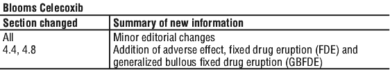 Serious skin reactions, some of them fatal, including drug reaction with eosinophilia and systemic symptoms (DRESS) syndrome (see Drug reaction with eosinophilia with systemic symptoms (DRESS)), exfoliative dermatitis, Stevens-Johnson syndrome, and toxic epidermal necrolysis, have been reported very rarely in association with the use of celecoxib. Fixed drug eruption (FDE) which may present as a more severe variant known as generalised bullous fixed drug eruption (GBFDE) has also been reported in association with the use of celecoxib. Patients appear to be at highest risk for these events early in the course of therapy: the onset of the event occurring in the majority of cases within the first month of treatment. Celecoxib should be discontinued at the first appearance of skin rash, mucosal lesions, or any other sign of hypersensitivity.