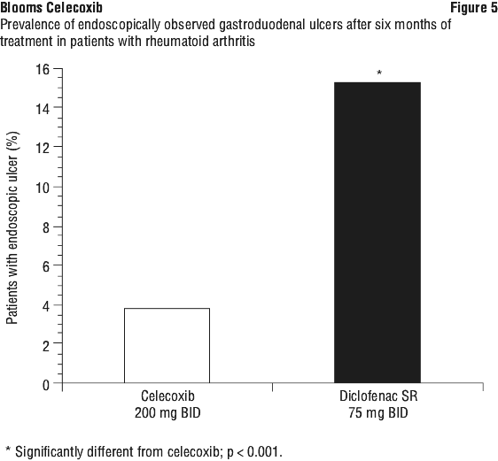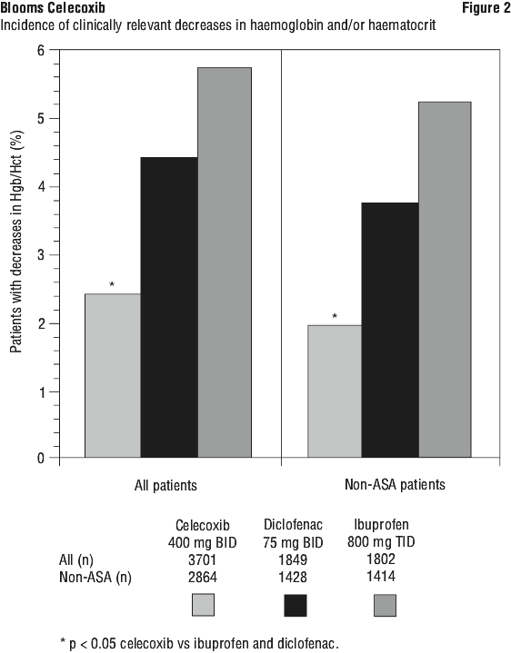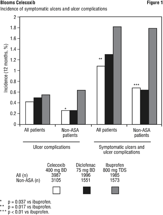 No statistically significant differences were demonstrated for the incidence of complicated ulcers among the three treatment groups in all patients. In an additional non-protocol specified analysis, there was no difference in the incidence of complicated and symptomatic ulcers in patients on celecoxib vs. those on diclofenac, although the incidence was significantly lower for celecoxib than for ibuprofen in all patients, and in those patients not taking aspirin (ASA) (Figure 1). Approximately 22% of patients were taking low-dose aspirin. Concomitant low-dose aspirin use increased the risk of complicated and symptomatic ulcers on celecoxib, diclofenac and ibuprofen (see Section 5.1 Pharmacodynamic Properties, Clinical trials, Use with aspirin). The incidence rates for diclofenac may be underestimated because of a higher incidence of early withdrawals due to GI adverse events than celecoxib and ibuprofen.