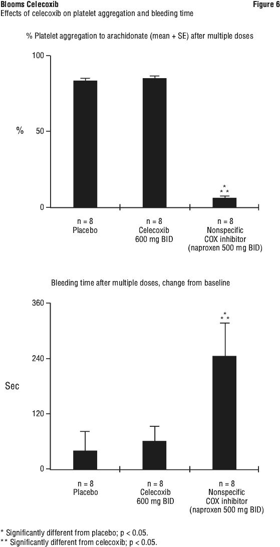 Platelet function. In healthy volunteers, celecoxib, at multiple doses of 600 mg BD (three times the highest recommended therapeutic dose) had no effect on platelet aggregation and bleeding time compared to placebo. Active controls (non-specific COX inhibitors i.e. naproxen, diclofenac, ibuprofen) all significantly reduced platelet aggregation and prolonged bleeding time (see Figure 6).