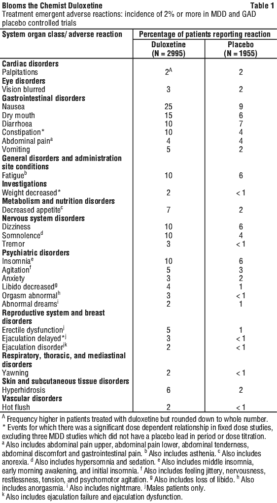 Blooms the Chemist Duloxetine is indicated for the treatment of: major depressive disorder (MDD); generalised anxiety disorder (GAD).