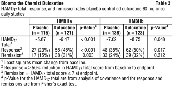 In both of these latter studies, the active comparator paroxetine also did not separate significantly from placebo on the primary outcome measure. Response (≥ 50% reduction in HAMD17 total score) and remission (HAMD17 total score ≤ 7) were also significantly higher with duloxetine compared with placebo in five out of six and three out of six acute studies, respectively.