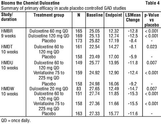 In all 4 acute placebo controlled studies the mean decrease in HAMA total score was significantly greater for duloxetine-treated patients compared with placebo treated patients as shown in Table 4.