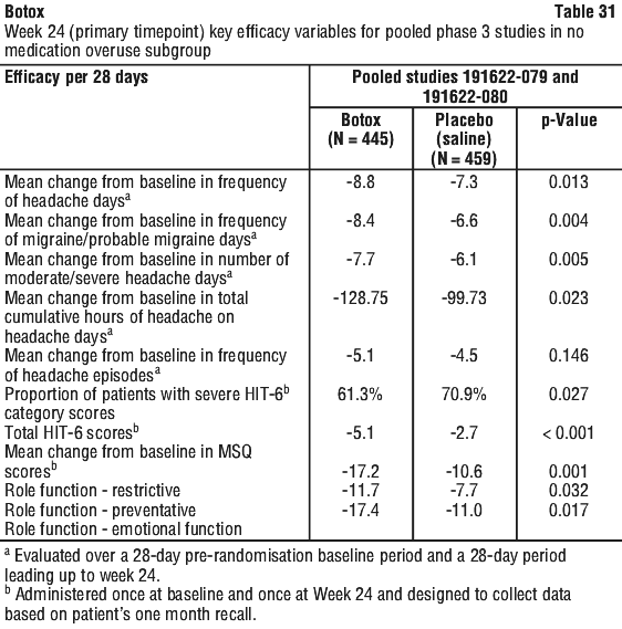 In both Phase 3 studies, significant improvements compared to placebo in the primary efficacy variable of change from baseline in weekly frequency of incontinence episodes were observed favouring Botox (200 U and 300 U) at the primary efficacy time point at week 6, including the percentage of dry patients. Significant improvements in some urodynamic parameters were observed, including decreases in peak detrusor pressure during the first involuntary detrusor contraction. Increases in maximum cystometric capacity were observed, but in patients who were spontaneously voiding these were offset by almost equivalent increases in post-void residual volume (please see last row of Table 27).