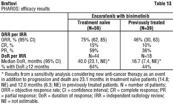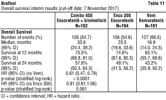 The efficacy results based on investigator assessment were consistent with the independent central assessment. The PFS analysis per investigator assessment showed an improvement of PFS in patients treated with Combo 450 compared with patients treated with vemurafenib (14.8 vs 7.3 months, respectively), HR 0.49 (95% CI 0.37, 0.64) (p < 0.001 one sided).