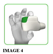 1.3 Hold the inhaler horizontally with the mouthpiece towards you and the green button facing straight up (see image 4).