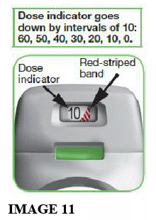 - When a RED STRIPED BAND appears in the dose indicator (see image 11); this means you are nearing your last dose, or