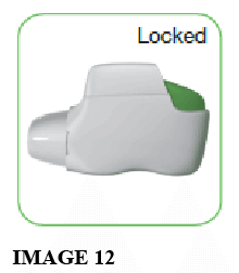 - When the last dose has been prepared for inhalation, the green button will not return to its full upper position, but will be locked in a middle position (see image 12). Even though the green button is locked, your last dose may still be inhaled. After that, the inhaler cannot be used again and you should start using a new BRETARIS GENUAIR inhaler.