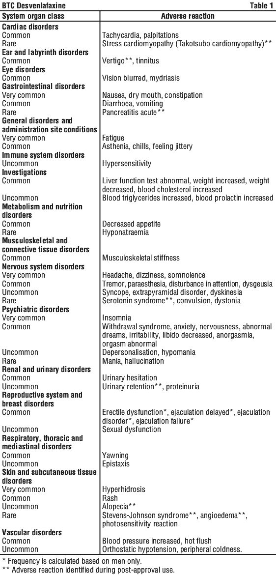 In clinical trials, there were uncommon reports of ischaemic cardiac adverse events including myocardial ischaemia, myocardial infarction, and coronary occlusion requiring revascularisation; these patients had multiple underlying cardiac risk factors. More patients experienced these events during desvenlafaxine treatment as compared to placebo (see Section 4.4 Special Warnings and Precautions for Use, Cardiovascular/cerebrovascular disease).