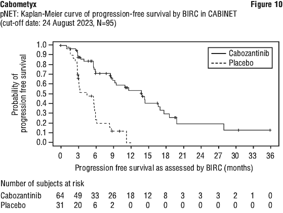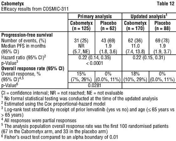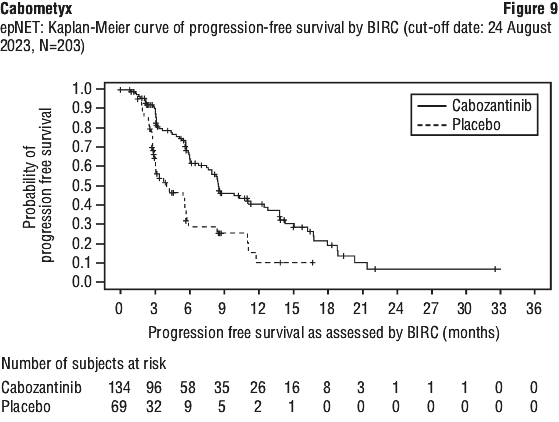 An updated OS analysis was conducted when 49 deaths were observed. OS data were not mature with 32 (48%) deaths in cabozantinib arm and 17 (52%) deaths in placebo arm (OS HR=1.01 [95% CI: 0.55, 1.83]). Fifty-two percent of placebo arm patients crossed over to open label cabozantinib, which may impact the OS endpoint.