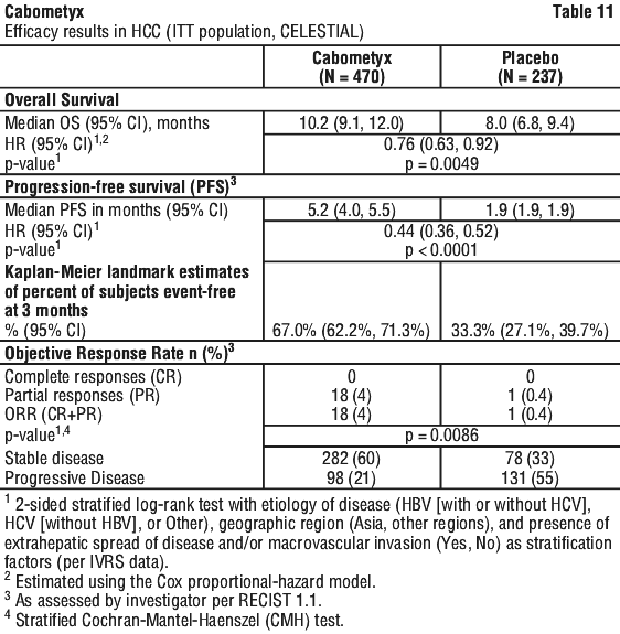 The incidence of systemic non-radiation and local liver-directed systemic non-protocol anticancer therapy (NPACT) was 26% in the cabozantinib arm and 33% in the placebo arm. Subjects receiving these therapies had to discontinue study treatment. An exploratory OS analysis censoring for the use of NPACT supported the primary analysis: the HR, adjusted for stratification factors (per IxRS), was 0.66 (95% CI: 0.52, 0.84; stratified logrank p-value = 0.0005). The Kaplan-Meier estimates for median duration of OS were 11.1 months in the cabozantinib arm versus 6.9 months in the placebo arm, an estimated 4.2-month difference in the medians.