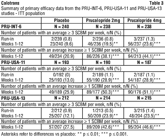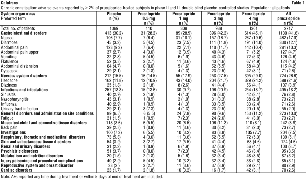 Efficacy and safety of prucalopride has been demonstrated only in patients with chronic functional constipation. Efficacy and safety of prucalopride in patients with secondary causes of constipation including endocrine disorders, metabolic disorders and neurologic disorders have not been assessed and use in these patients is not recommended. Efficacy and safety of prucalopride in patients with medication-related constipation, including constipation due to opioid use as a secondary cause of constipation, has not been demonstrated and use of Calotrans is not recommended.