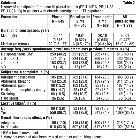 The efficacy of prucalopride was established in three multicentre, randomised, double-blind, 12-week placebo-controlled studies in subjects with chronic constipation (n=1,279 on prucalopride, 1,124 females, 155 males) namely PRU-INT-6, PRU-USA-11 and PRU-USA-13. The studies consisted of 2 phases: a 2-week drug-free run-in phase followed by a randomised, 12-week, double-blind, placebo-controlled treatment phase. The prucalopride doses studied in each of these three studies included 2 mg and 4 mg once daily. The respective mean ages of patients in the three studies were 43.9, 48.3, and 47.9 (range 17-95) years. Patients with secondary causes of constipation including opioid use, endocrine disorders, metabolic disorders and neurologic disorders were excluded from the studies. Table 2 provides a summary of the constipation history (prior to study enrolment) demonstrating that the patients enrolled were chronically constipated. Over 70% of patients had ≤ 1 SBM at baseline and more than 80% indicated that prior therapy was inadequate.