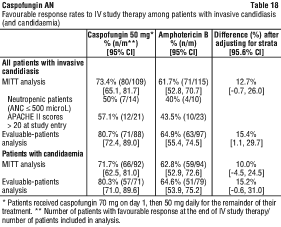 Response rates were also consistent across all identified Candida species. For all other efficacy time points (Day 10 of IV study therapy, end of all antifungal therapy, 2-week post-therapy follow-up, and 6- to 8-week post-therapy follow-up), caspofungin was as effective as amphotericin B. Caspofungin was also comparable to amphotericin B with regard to relapse or survival rates, with an overall mortality among MITT patients during the study treatment period and 6 to 8-week follow-up period of 33.0% in the caspofungin group and 30.4% in the amphotericin B group.