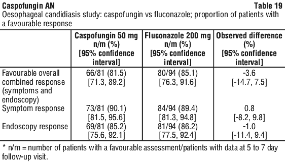 In addition, two double-blind, comparative dose-ranging studies evaluated 3 different doses of caspofungin (35, 50, 70 mg/day) and amphotericin B (0.5 mg/kg/day). These clinical studies support the use of caspofungin 50 mg daily in the treatment of oesophageal candidiasis. Increasing doses of caspofungin above 50 mg daily provided no additional benefit in the treatment of oesophageal candidiasis.
