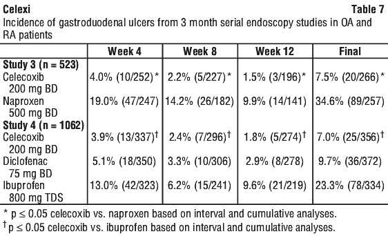 In the ITT population for the CSGIE endpoint there were no significant differences, in the pairwise comparisons between treatment regimens (data not shown). For the endpoint of iron deficiency anaemia of GI origin, significant differences (celecoxib vs naproxen; celecoxib vs ibuprofen) and non-significant differences (ibuprofen vs naproxen) were observed in a manner consistent with the data presented above.