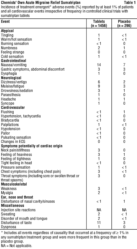 - Do not take more CHEMISTS' OWN ACUTE MIGRAINE RELIEF SUMATRIPTAN TABLETS or any other form of sumatriptan, if the first dose has not provided any relief from your symptoms.