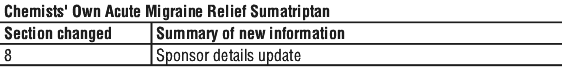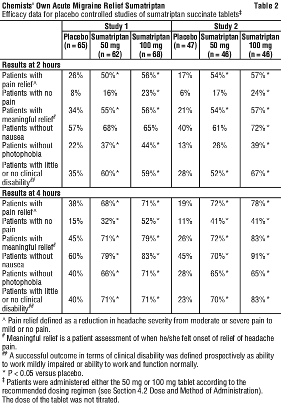 - If your migraine is not relieved by CHEMISTS' OWN ACUTE MIGRAINE RELIEF SUMATRIPTAN TABLETS you may use CHEMISTS' OWN ACUTE MIGRAINE RELIEF SUMATRIPTAN TABLETS on another occasion to treat another migraine attack.