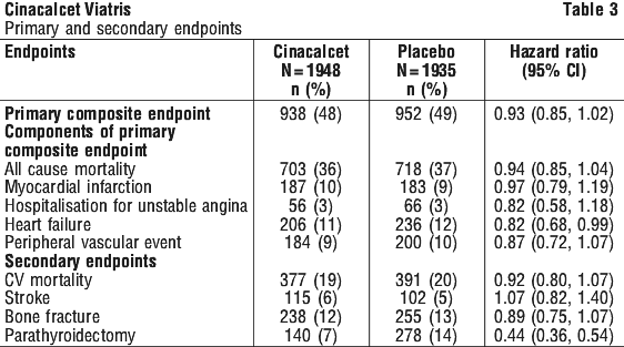 The incidence of serious adverse events (29% vs 31%) and deaths (2% vs 3%) was similar in the cinacalcet and placebo groups, respectively.