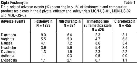The majority of clinical trials have been conducted in adult or adolescent females aged 12 years or above. The most common adverse reactions following the single 3 g dose of fosfomycin trometamol involved the gastrointestinal tract, mainly diarrhoea. These events were usually self-limited in duration and resolve spontaneously. Table 1 lists drug-related adverse events which occurred in 1% or more of fosfomycin recipients in the three pivotal trials.